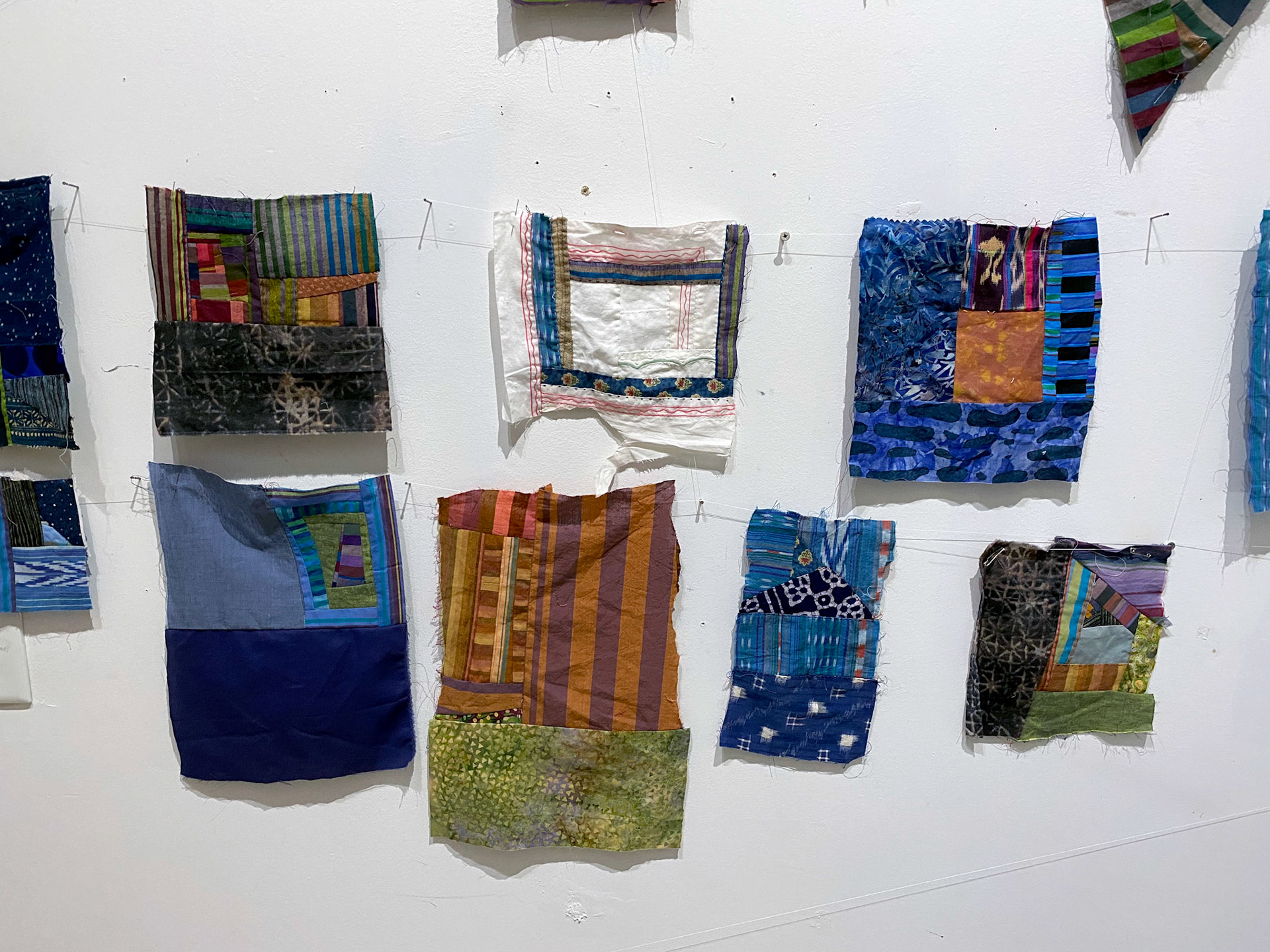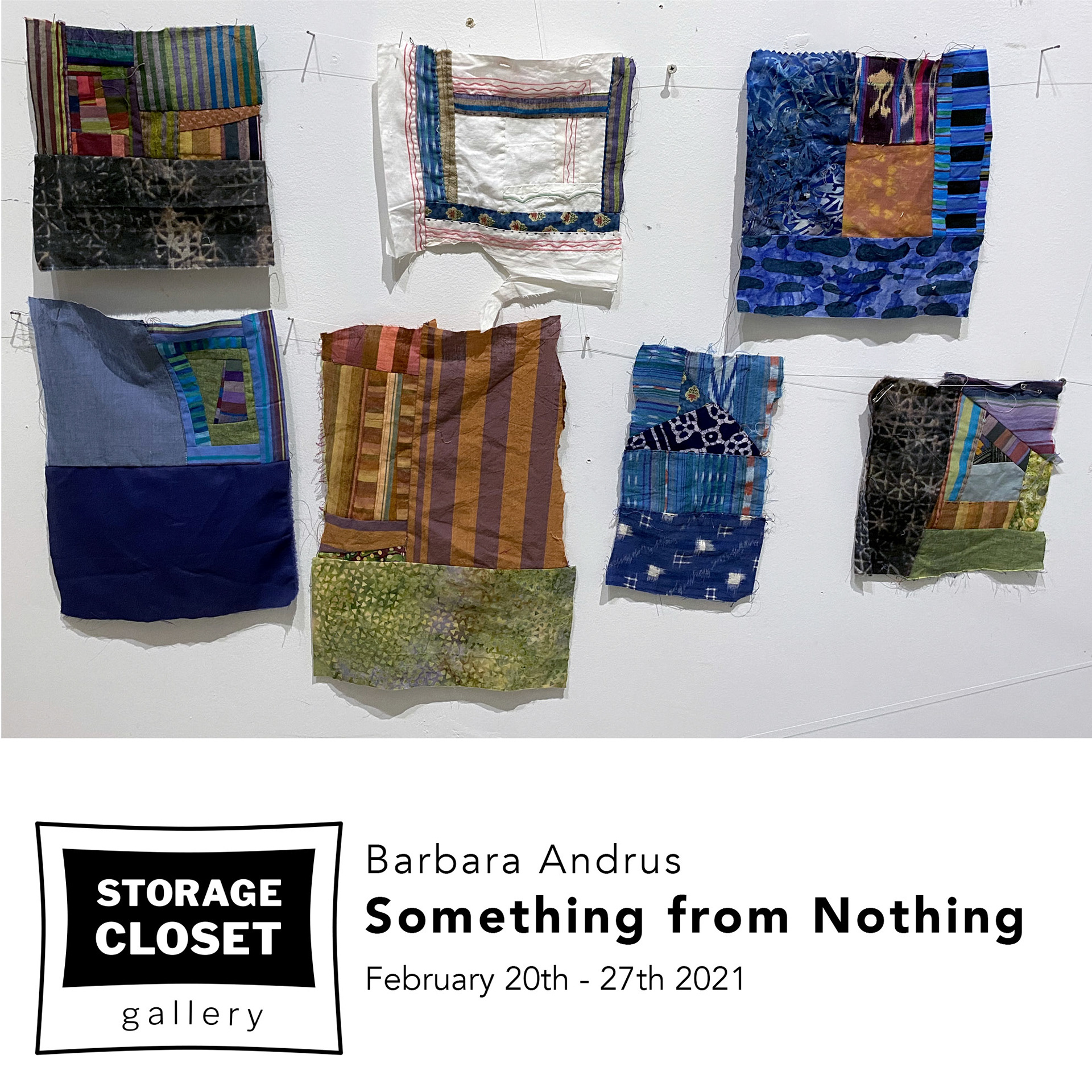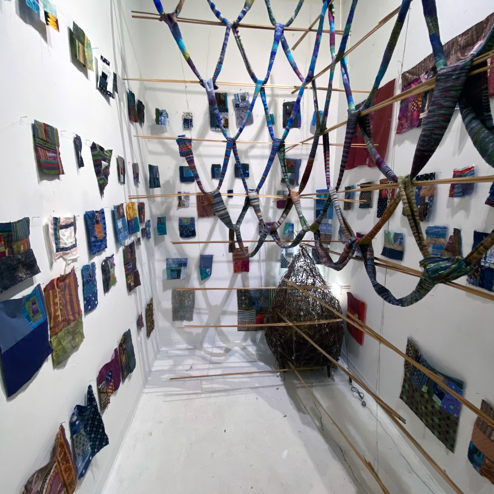 For Barbara Andrus, making something from nothing – sewing scraps and fabric discards from friends – suits the moment. During this COVID 19 calamity sewing took on much more intensity and meaning for her. Much of the cloth in Andrus’ installation was en route to becoming a quilt. Dissatisfied with that outcome, however, Andrus instead disassembled the quilt in progress and exploded it to fill the gallery.