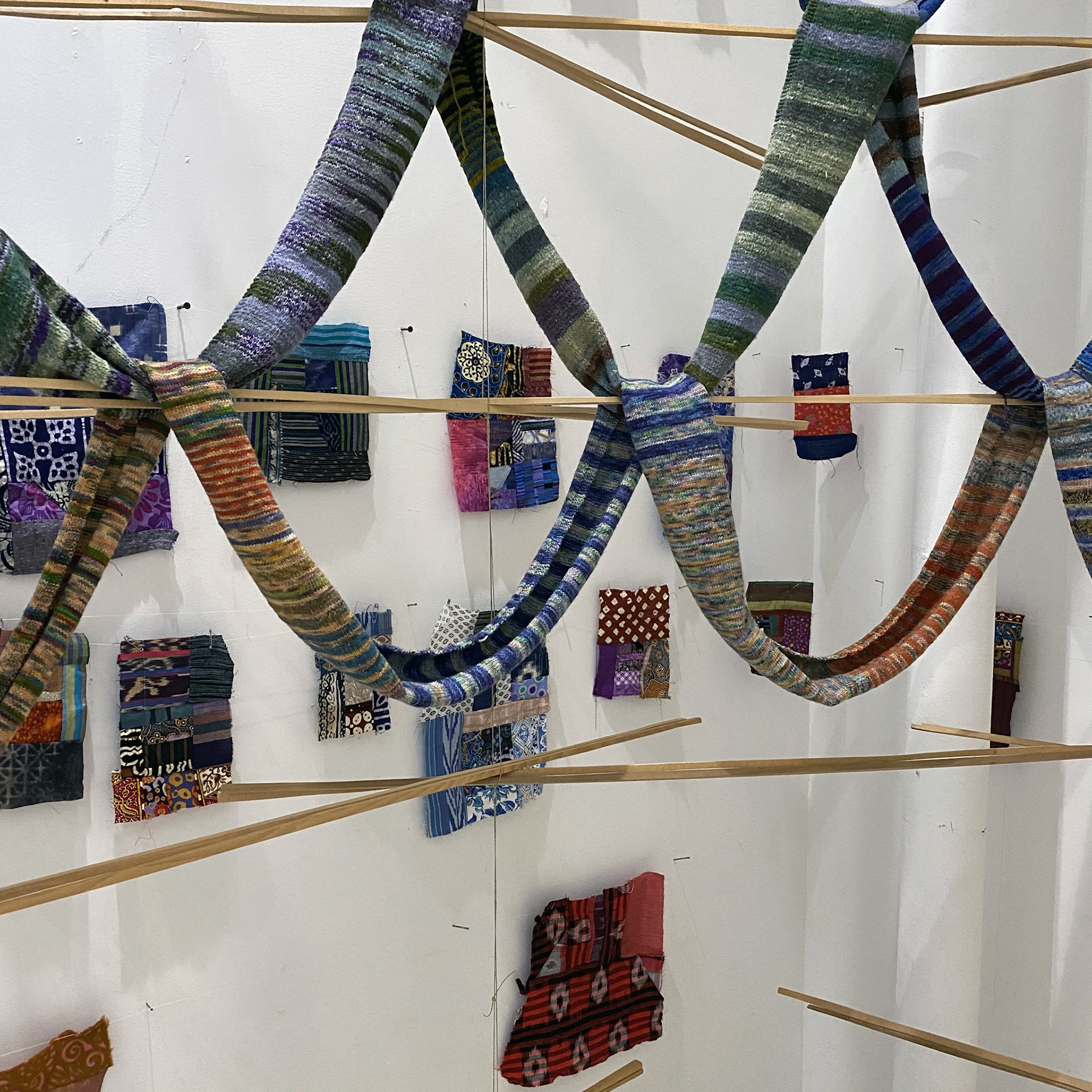 Floating among the pieces of the deconstructed quilt hangs a length of knitting that Andrus begin in 2013 during one of her many walks. Andrus has used this growing length over the years in multiple creative incarnations. The now 150 foot knit length stretches through the gallery space implying Andrus’ emotional journey through the wreckage of the pandemic.