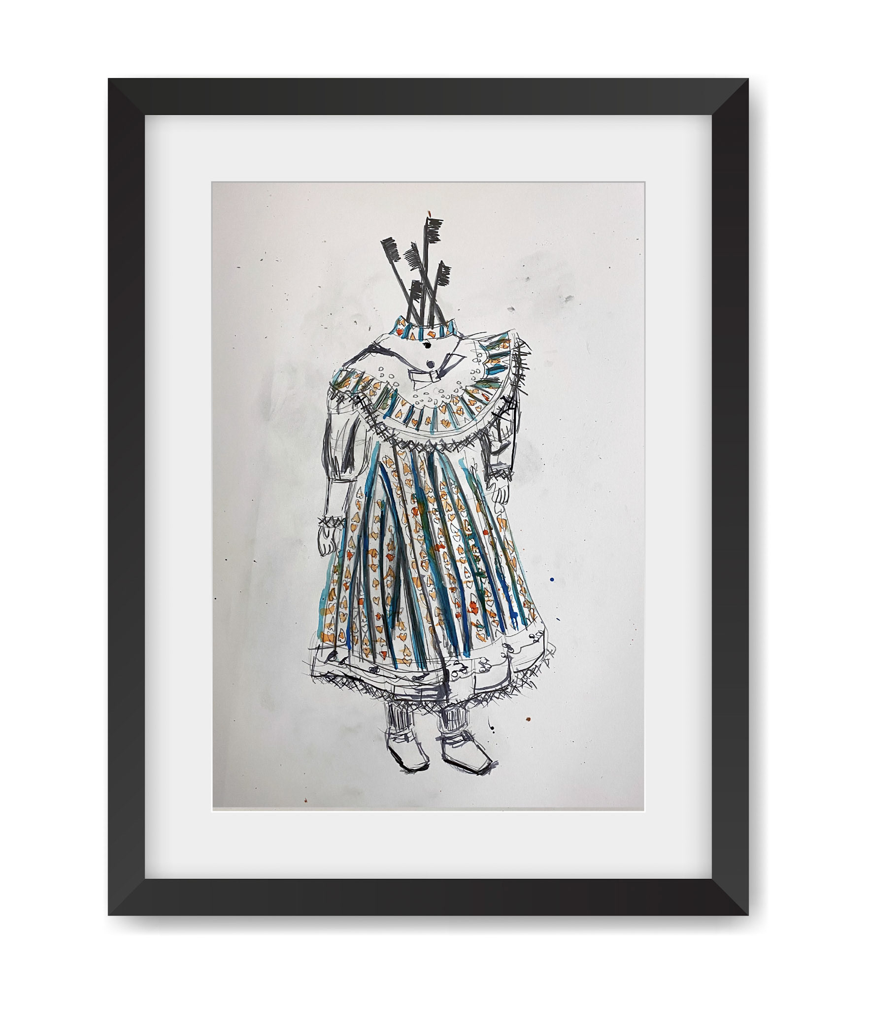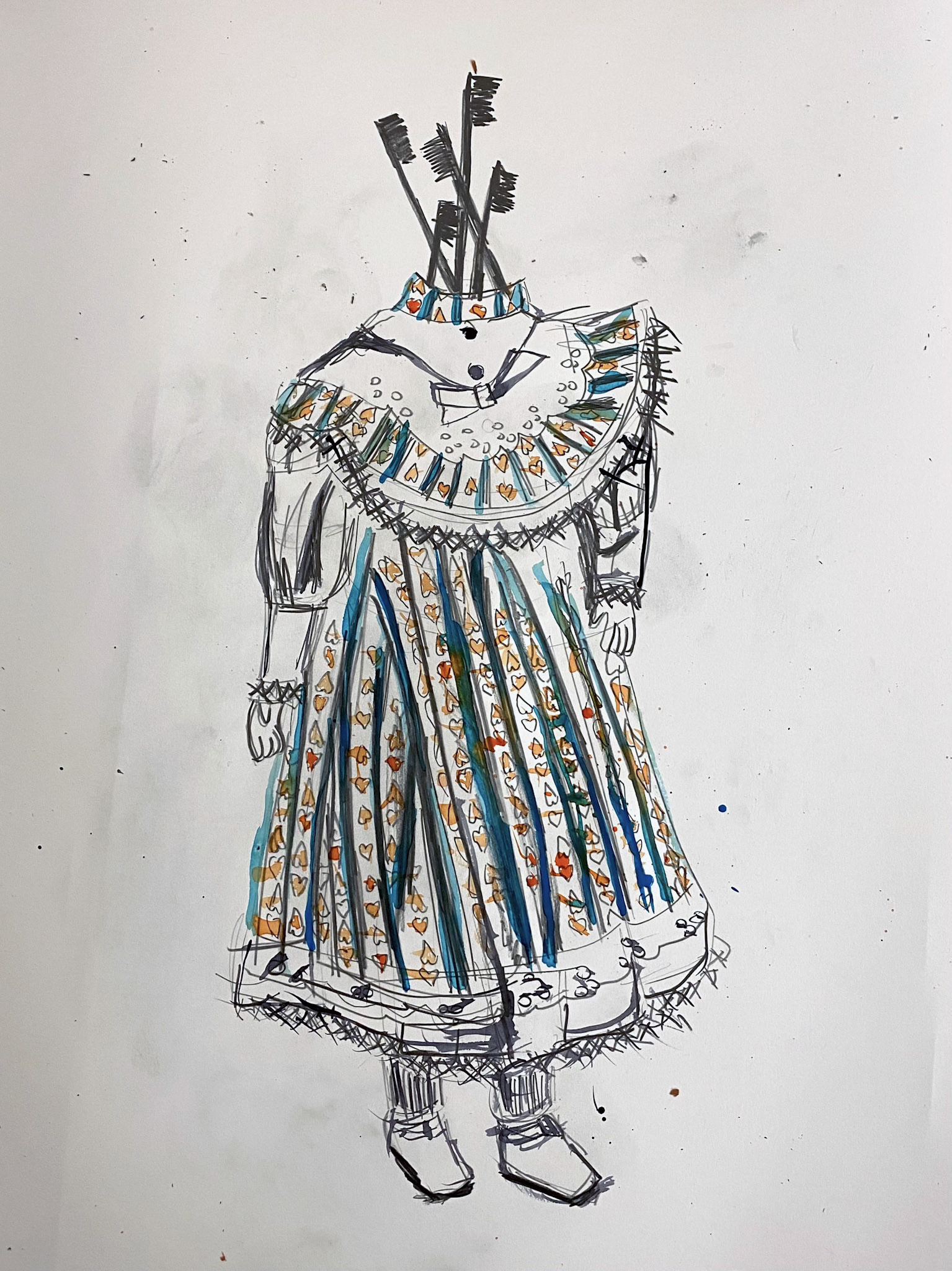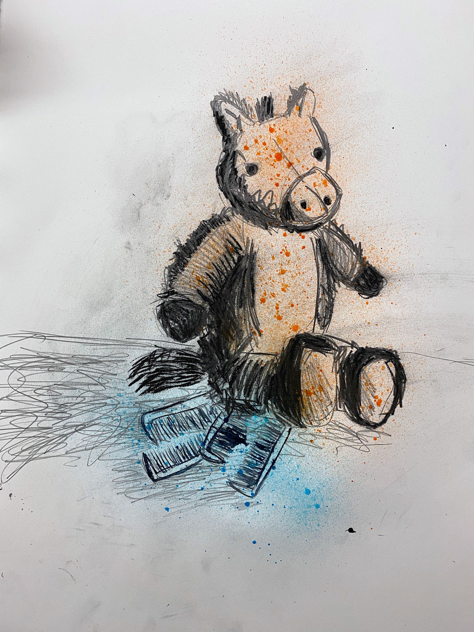 Toothbrushes are embodied and combs invade children's space in Alves' series of drawings reacting to the 2019 New York Times article reporting that undocumented children held in detention in the state of Texas in were lacking basic hygiene supplies. The government argued that "amenities such as soap and toothbrushes should not be mandated..."